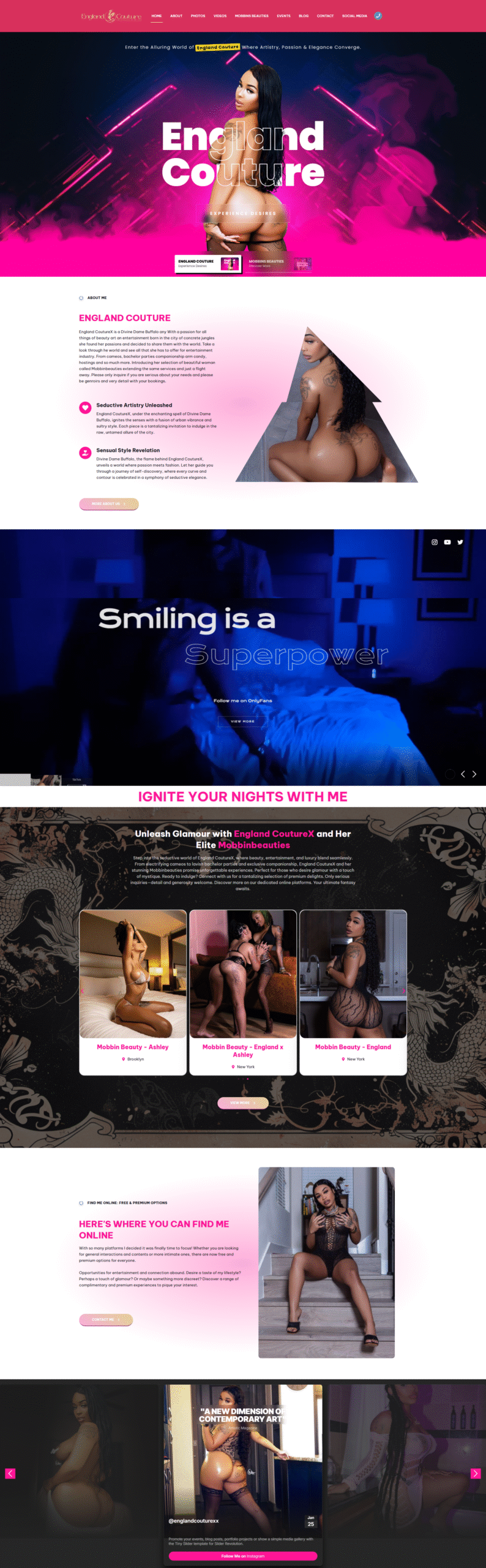 This project focused on creating a platform that embodies England Couture’s fierce confidence and glamorous appeal. From captivating visuals to a smooth user experience, the website offers fans a sleek way to explore her brand, connect with her content, and stay in the loop with upcoming appearances.